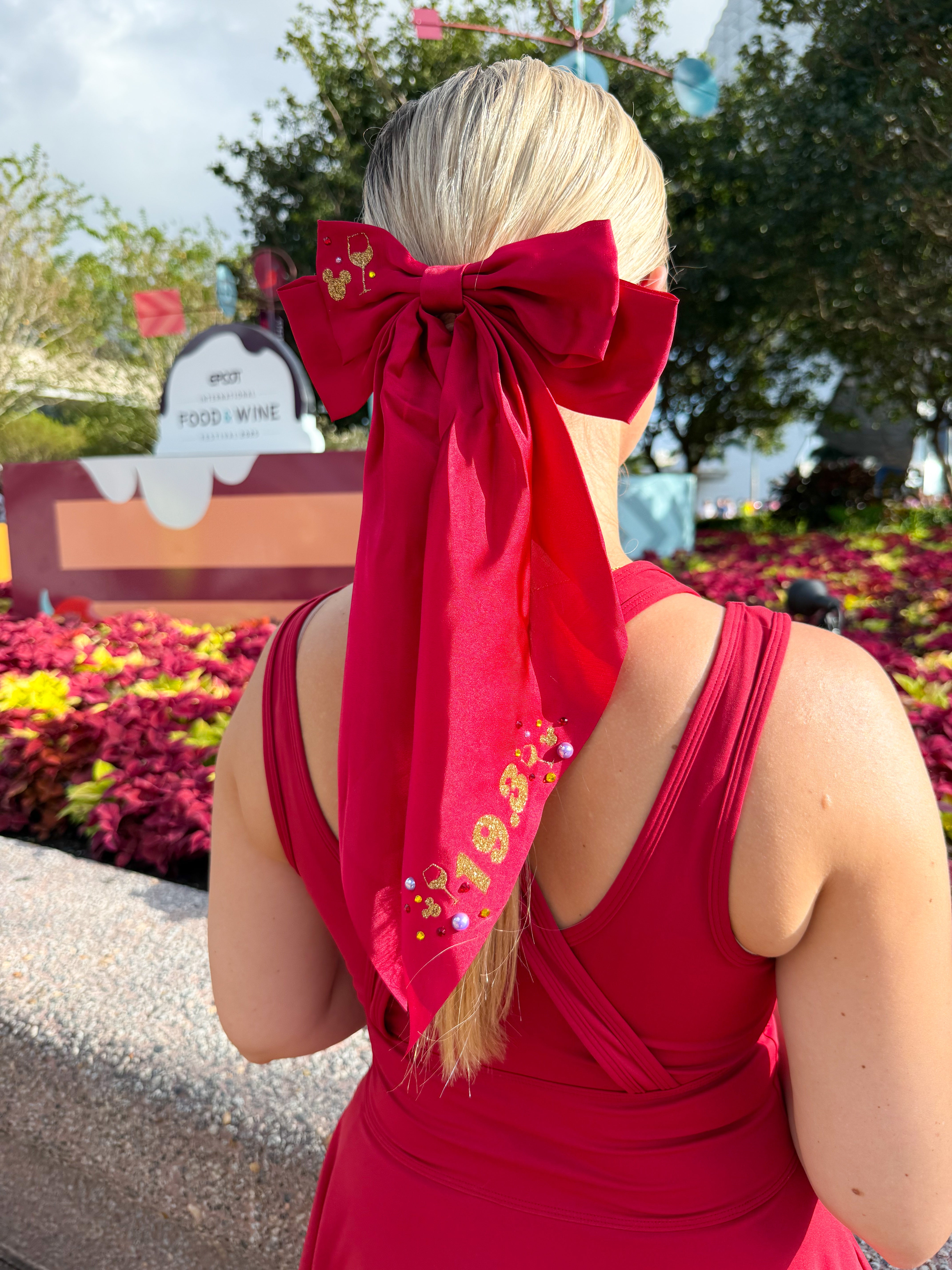 Celebrate Wine & Dine Weekend with this stunning burgundy hair bow, adorned with the challenge distance "19.3" in gold glitter! Accented with dazzling rhinestones and a touch of Wine & Dine magic, this bow is perfect to rep those hard earned miles!