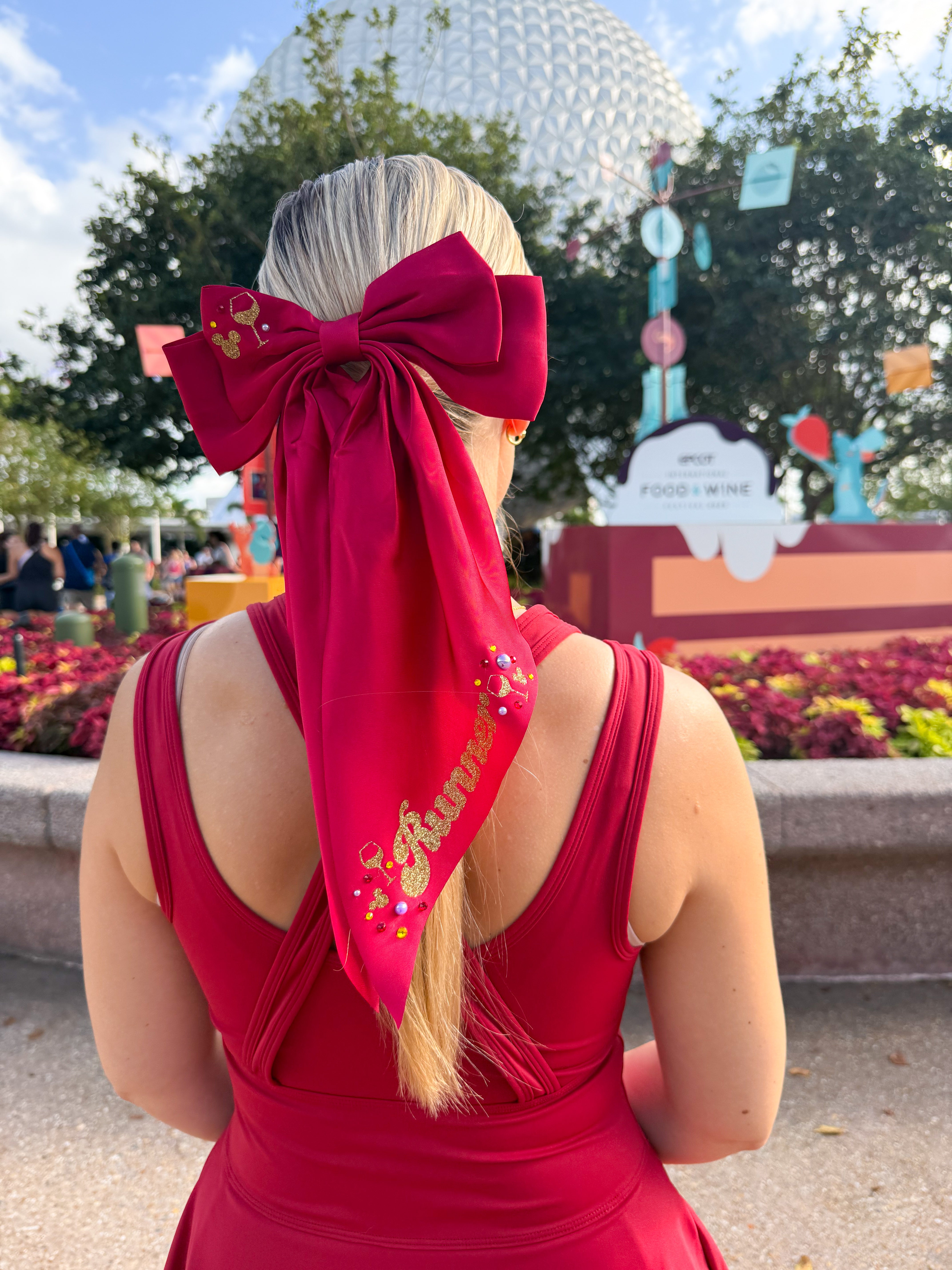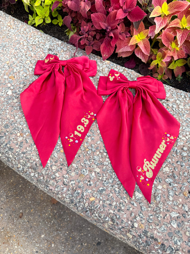 Celebrate Wine & Dine Weekend with this stunning burgundy hair bow, adorned with the word "Runner" in gold glitter! Accented with dazzling rhinestones and a touch of Wine & Dine magic, this bow is perfect to rep those hard earned miles!