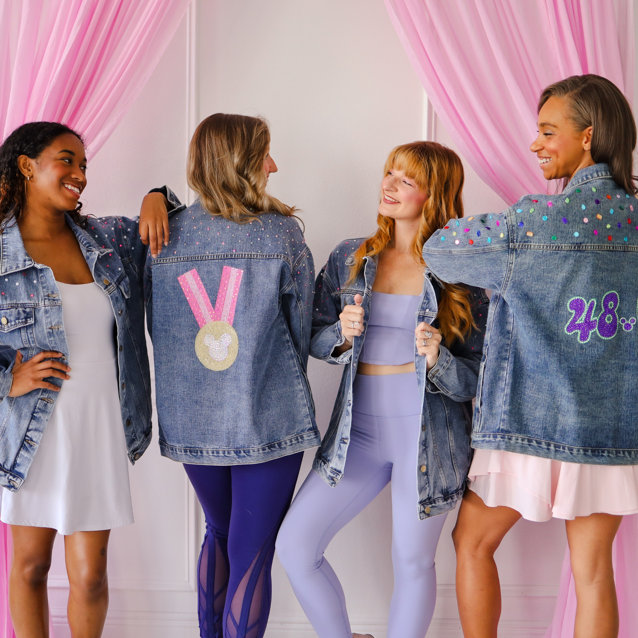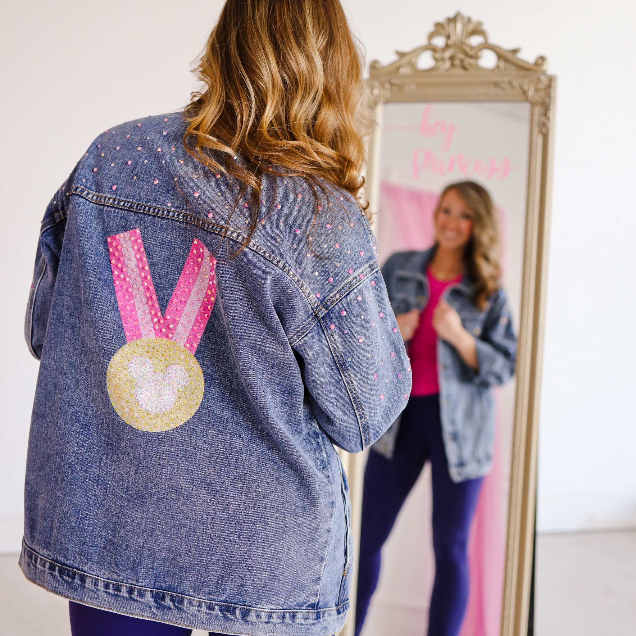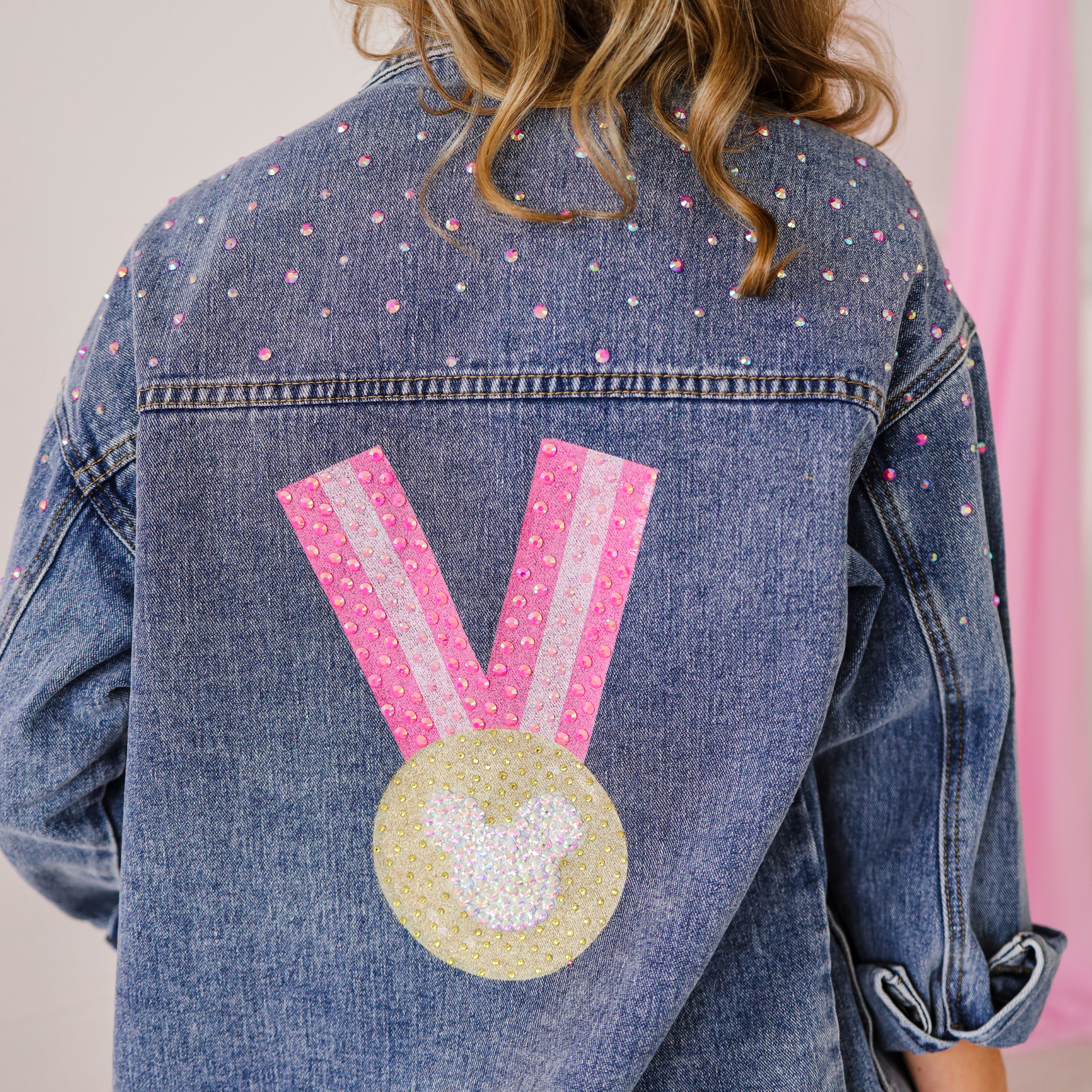Add a touch of glamour to your wardrobe with our Magical Miles Denim Jacket! Featuring our iconic Magical Miles design across the back bedazzled with hand placed stones. This jacket is the perfect blend of trendy and glam. The front of the jacket is adorned with delicate pink rhinestone details, adding a pop of color and sparkle to your look.