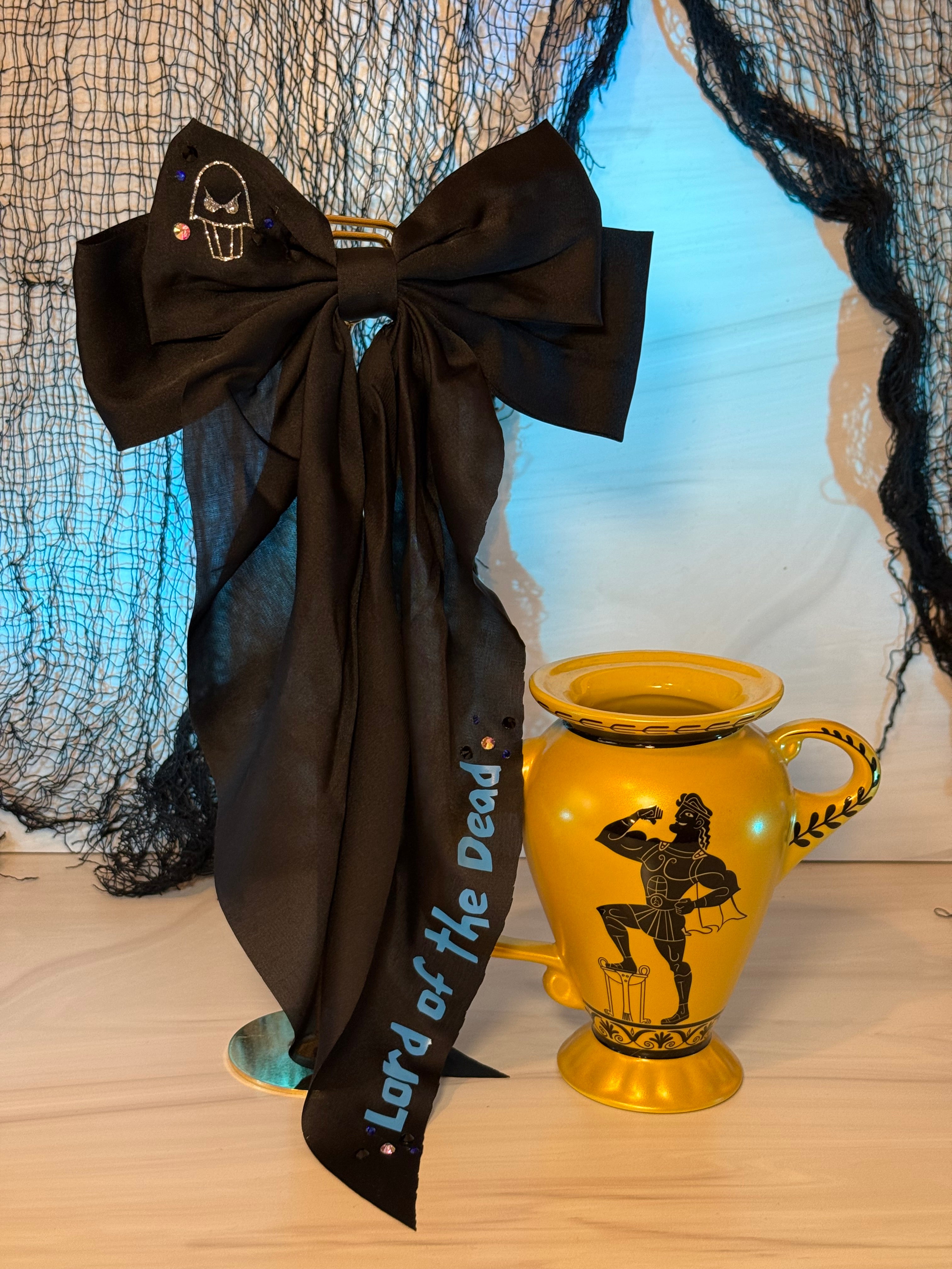 This Black hair bow is adorned with the words "Lord of the Dead" and a silver glitter skull! Accented with dazzling rhinestones and a touch of magic, this bow is perfect for a spooky outfit!
